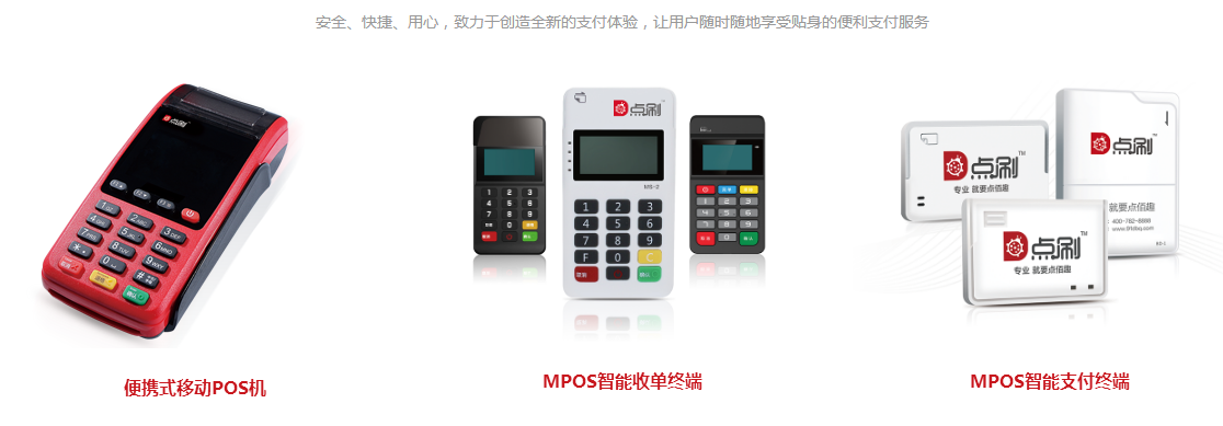具体表现为点佰趣旗下多样化的点刷POS机——便携式移动POS机、MPOS智能收单终端、MPOS智能支付终端等等产品,无论是刷卡、扫一维码、扫二维码还是其他收款或者支付方式,都能找到适合自身收款或支付的产品,满足不同需求。