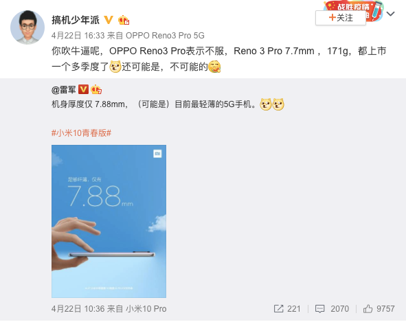 最近,小米一款全新青春版机型开始了官宣,这款新机命名为小米10青春版,从名字就不难看出,该机将会在小米10的基础上有所减配。随着发布日期的临近,雷军也开始为这款新机进行预热,而雷军在预热时,把小米10青春版的机身厚度做了重点宣传,并称7.88mm可能是目前最轻薄的5G手机,而这条微博引发了Reno3 Pro用户的热议。
