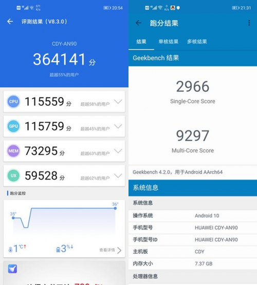 有了麒麟820的硬核参数,再来看看它的跑分如何?在安兔兔跑分测试中,麒麟820的成绩为364141分,geekbench单核2966分,多核9297分,单核跑分比去年神U麒麟810提升8.5%,多核跑分提升了21.3%,这是一个夸张的数据,已经可以与友商的旗舰级芯片比肩了,可见麒麟820在同级别芯片中的竞争力有多可怕。