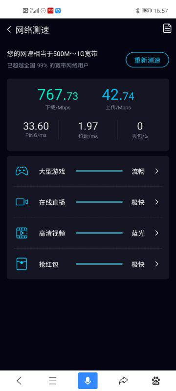 麒麟820性能强劲已经是属于正常范畴的事情,毕竟荣耀的性能技术一直都十分突出,所以荣耀给消费者加上了一个新惊喜,就是麒麟820的5G能力!麒麟820使用集成5G基带技术,有着更高的集成度,是目前5G芯片技术最高的工艺和最佳的选择,麒麟820将和麒麟990一样的5G Modem集成到芯片上,具备低能耗,更大内部空间等的优点,而且麒麟820支持NSA/SA 5G双模网络的所有5G频段,未来几年无论运营商在普及5G过程中如何进行网络升级,麒麟820给消费者带来的旗舰级5G体验也不会受到影响。笔者带大家通过SPEEDTEST软件感受了一下麒麟820 5G SoC的5G速度,甚至已经超出了运营商最高1Gbps的速度,这样的5G速度堪比“闪电侠”。