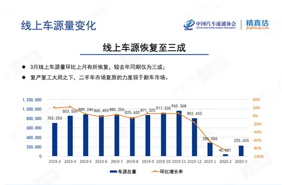 进入3月以来,随着疫情逐渐得到控制,二手车市场开始逐渐回暖。根据中国汽车流通协会的最新数据显示,截至3月9日,全国二手车交易市场复工率为71.28%,二手车商的复工率为90.8%。从二手车供应量看,目前在线车源已经恢复到了同期的三成左右。