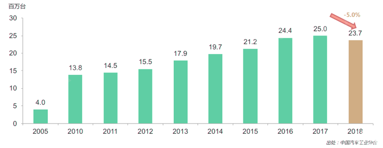 从图上可以看出,2018年之前的15年时间,中国的汽车销售保持了持续的快速增长。2018年是一个分水岭,汽车销量为5%的负增长。相关机构预测,2019年销量进一步负增长的概率很大。