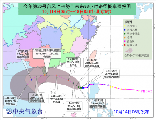 今年第20号台风“卡努”(热带风暴级)目前已进入南海东部海面,以后转向西偏北方向移动,正向南海岛东部和广东西部带沿海靠近,强度逐渐加强,最强可达强热带风暴级或台风级(11-13级,30-38米/秒)。预计将于15日傍晚到16日早晨在海南三亚到广东湛江一带沿海登陆。