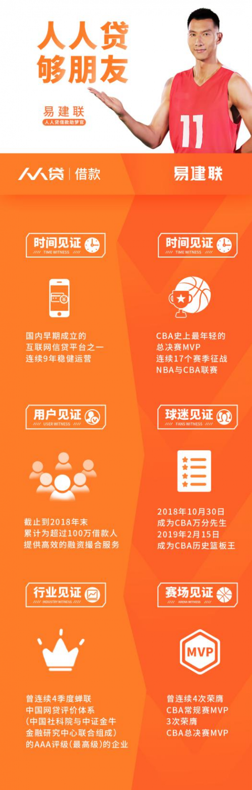 两个各自行业的领军者,备受用户和球迷的支持和信赖,现在易建联成为人人贷借款助梦官,将为更多的小微企业主用户助威助力。