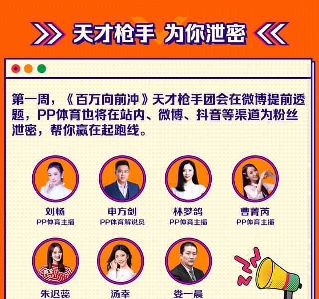 据悉,《百万向前冲》在答题玩法上做了众多升级,带来了更多互动答题神器,帮助用户更好地答题通关。申方剑、娄一晨、刘畅、林梦鸽等PP体育解说和主播将组成天才枪手团,直播答题当天会在微博中提前泄题,PP体育还将在微博、抖音等官方账号为粉丝泄密,帮用户赢在起跑线。