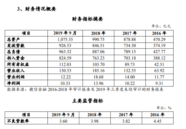 根据捷赢2020年第二期个人消费贷款资产支持证券发行说明书显示,截至2019年9月底,捷信消金的总资产为1075.35亿元,2019年1月至9月,新增贷款发放量约为695.47亿元,贷款余额为926.53 亿元,资本充足率为 11.43%,不良贷款率为3.6%。其中,不良贷款率较2018年末下降了0.38个百分点,2016和2017年的不良贷款率分别为4.45%和3.82%。