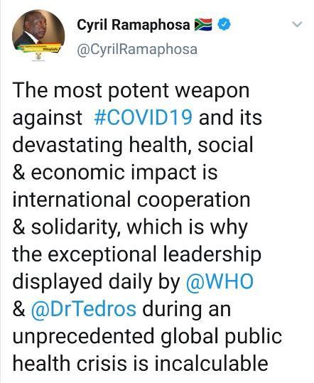 △非盟轮值主席国南非总统拉马福萨指出国际合作和团结对于抗击新冠疫情至关重要