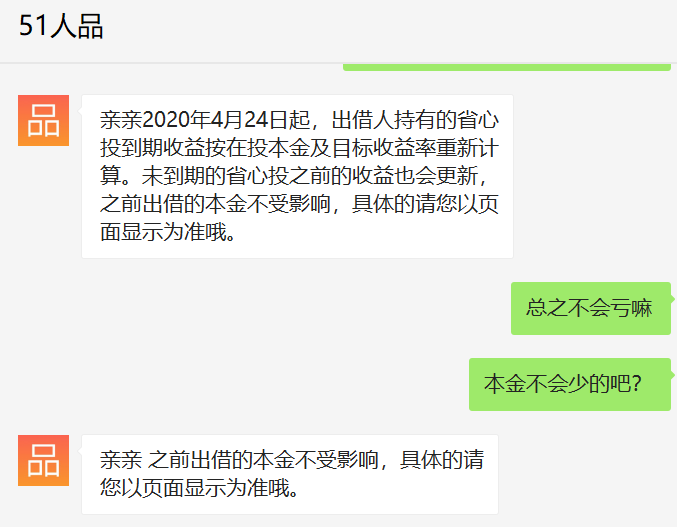 P2P业务将全面清退的公告发布后半个月,4月15日,51人品“省心投”下架;4月22日,51人品在其APP上发布了一则通知,称受到疫情影响,网贷平台逾期上升,大量出借资金逾期无法回收,根据平台的测算,出借人的实际收益将远低于协议约定收益,甚至影响收回本金。公司决定于2020年4月24日起,对出借人持有的省心投到期收益按在投本金及目标收益率重新计算。