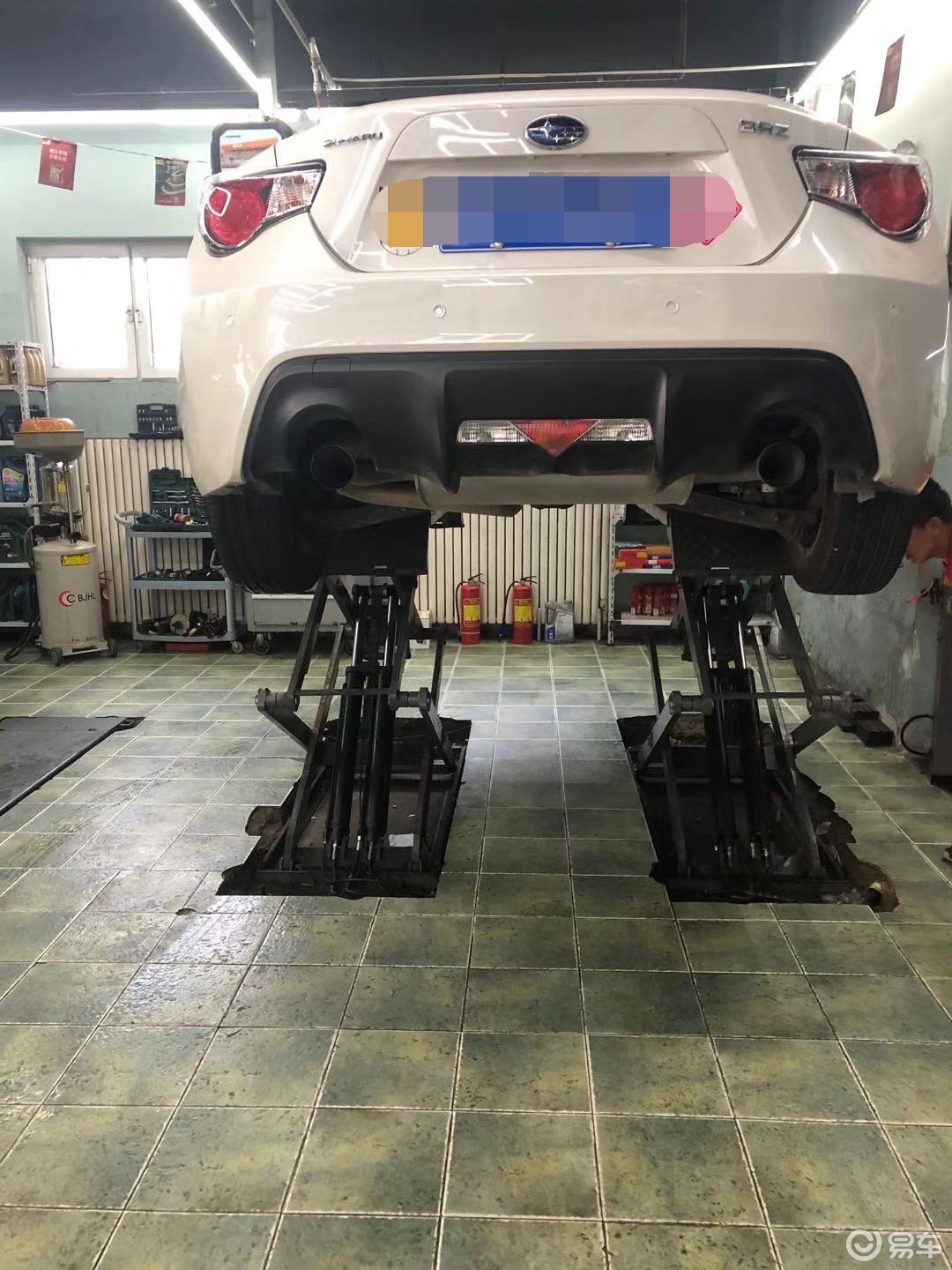 顺路开到了修车厂,把车子举高高,下盘就暴露在我们眼前了,从这个角度看过去,BRZ的车屁股还是挺性感的。