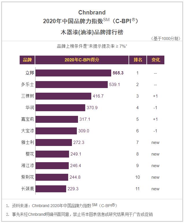 2020年中国品牌力指数SM(C-BPI®)木器漆(油漆)品牌排行榜显示,立邦、多乐士、三棵树、华润、嘉宝莉、大宝漆、雅士利、樱花、湘江漆、紫荆花、长颈鹿的C-BPI得分分别为565.3、539.1、416.7、370.9、317.1、309.0、272.3、249.1、246.4、244.8、229.3,分别排名第1-11位。