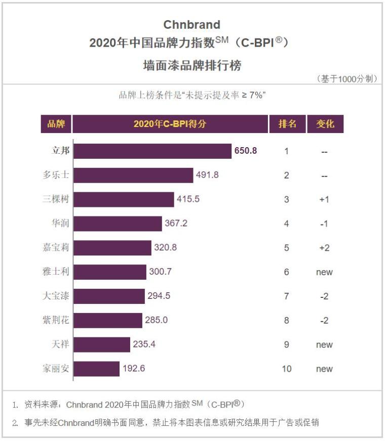 2020年中国品牌力指数SM(C-BPI®)墙面漆品牌排行榜显示,立邦、多乐士、华润、三棵树、华润、嘉宝莉、雅士利、大宝漆、紫荆花、天祥、家丽安的C-BPI得分分别为650.8、491.8、415.5、367.2、320.8、300.7、294.5、285.0、235.4、192.6,分别排名第1-10位。