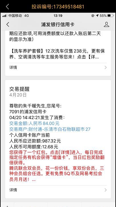 该消费者在4月21日再次反映,称之前浦发银行信用卡工作人员说不开通就不用还钱,现在又说无论是否开通都要还钱。