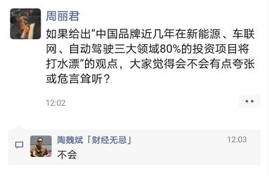 如果给出“中国品牌近几年在新能源、车联网、自动驾驶三大领域80%的投资项目将打水漂”的观点,大家觉得会不会有点夸张或危言耸听?”