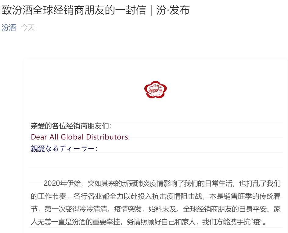 新京报讯(记者 郭铁)3月6日,汾酒集团用中、日、英三国语言向全球经销商发布了一封公开信。信中直言,受新冠肺炎疫情影响,汾酒市场营销工作被迫按下暂停键,但“我们不恐慌、不茫然”。截至目前,汾酒生产车间、职能部门、后勤单位已陆续复工,希望各经销商能够坚定信心,稳定产品价格,精准调整营销策略,为疫情后的全面复工做好准备。