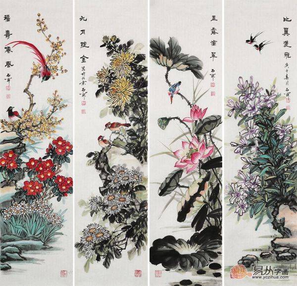 春天令人欢欣鼓舞,夏日晴空灿烂多姿,秋天是丰收的季节,冬天一切是显得如此安详。春夏秋冬四季美景代表人生美满,四时变幻皆体现在画中,若是家中拥有这样一幅画作,实乃一件乐事。石开老师将开于四季的不同花卉百合、夏荷、秋菊、冬梅一起入画,繁花盛开,雀鸟啾鸣,相互呼应,相得益彰,是不可多得的花鸟艺术佳品,值得品味赏鉴。