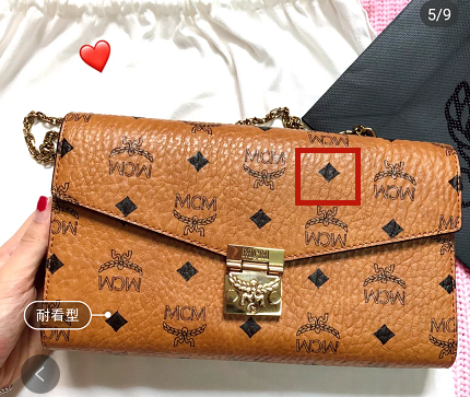 3.下方类似一个人在蹲马步,底部是位置是不在以水平线.MCM包上的标志牌表面光滑如镜,完全可以当镜子用。