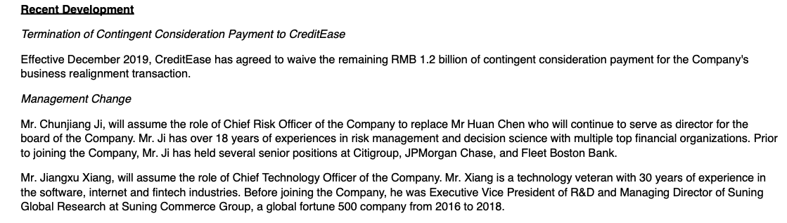 此外,宜人金科披露,终止向宜信支付转让对价款。文中称,母公司宜信同意放弃剩余12亿公司业务重组交易的对价款,已于2019年12月生效。