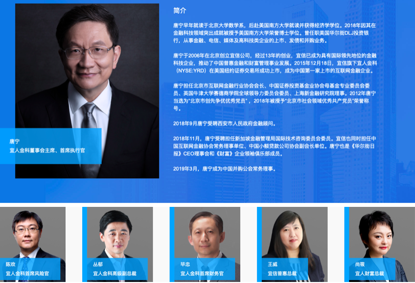此外,宜人金科高管层自重组以来持续动荡。上述最新进展披露,宜人金科的首席风控官(CRO)和首席技术官(CTO)变更。首席风控官由陈欢变更为Chunjiang Ji,宜信副总裁兼首席技术官向江旭担任宜人金科首席技术官,原首席技术官兼COO曹阳在2019年上半年因个人原因辞职。目前,宜人金科官网介绍,CRO仍显示为陈欢。