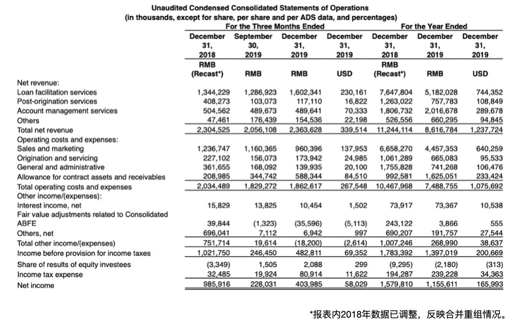 2019年,宜人金科营收支柱贷款撮合服务收入下调32%至51亿;贷后服务收入下调40%至7.57亿;账户管理服务收入上调10%至20.16亿;其他收入6.6亿。