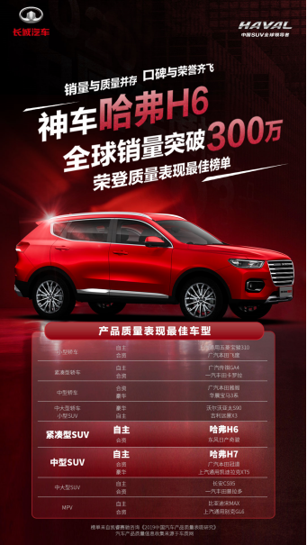 作为全球销量突破300万辆的“国民神车”,哈弗H6一直保持着行业领先的产品竞争力。前不久,在《2019中国汽车产品质量表现研究》这一重量级的行业研究报告中,哈弗H6凭借可靠的产品品质,成为细分领域紧凑型SUV中的自主标杆,再次彰显了国民神车的不俗实力。