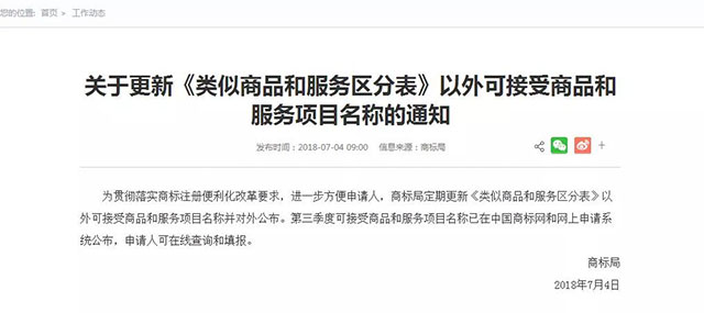 关于《类似商品和服务区分表》需要引起注意,会根据尼斯分类进行修改,注册时注意查询当下的版本,也会根据生产发展需要更新《类似商品和服务区分表》以外可接受商品和服务项目名称,如果你在现有的《类似商品和服务区分表》实在找不到自己想要的类别,可以在中国商标网上查看有无更新,如下图,