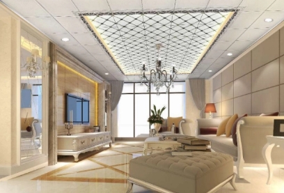 井格式吊顶是利用井字梁因形利导或为了顶面的造型所制作的假格梁的一种吊顶形式。配合灯具以及单层或多种装饰线条进行装饰,丰富天花的造型或对居室进行合理分区。