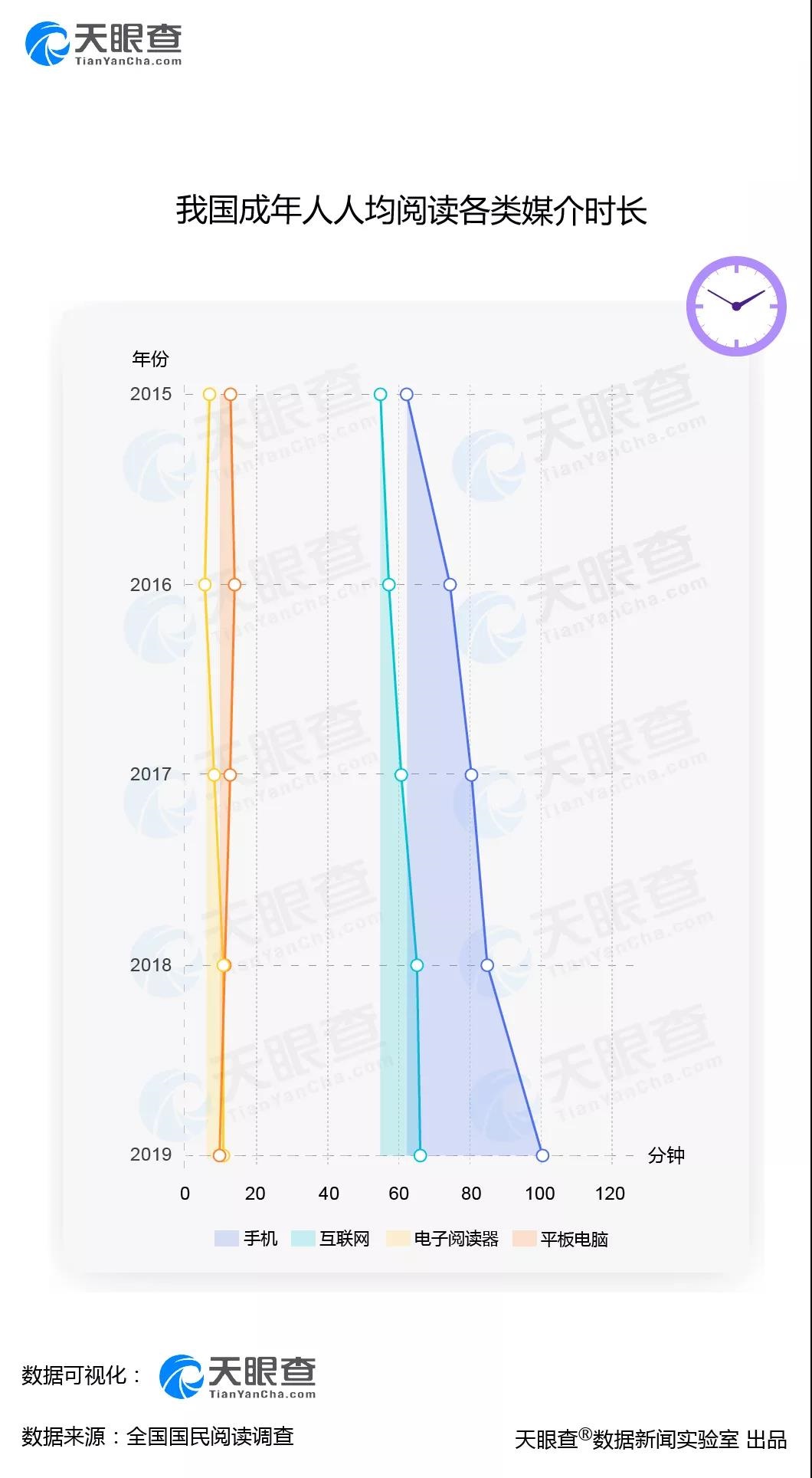 国民阅读调查结果显示,过去五年,我国成年国民人均花在手机上的时间明显上升,且排在各类媒介之首。2019年,我国成年人浏览手机的平均时间达到100.41分钟。