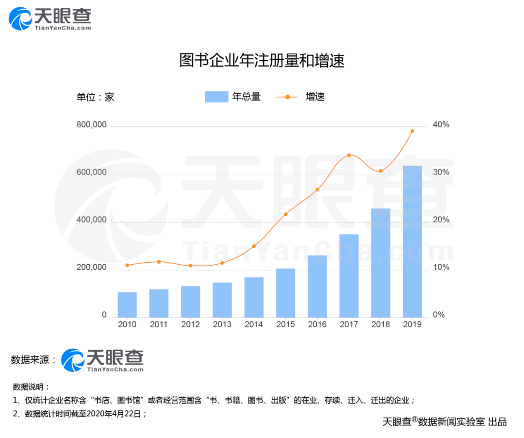 从成立时间来看,我国的图书行业非常年轻,有接近70%的图书相关企业成立于2015年及以后。具体来看,仅2019年,我国图书相关企业就成立了近18万家,年注册增速达39%以上。另外,2020年以来新增图书相关企业近3.3万家,占比约4%。