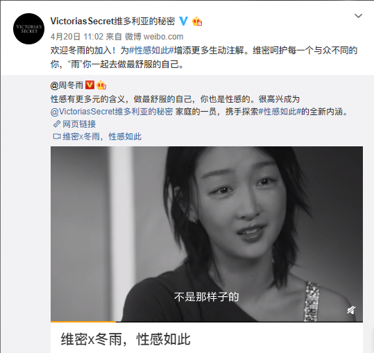 4月20日,美国内衣品牌维多利亚的秘密Victoria’s Secret宣布周冬雨为大中华区品牌代言人,要“去诠释性感的全新内涵”,引发业界密切关注。