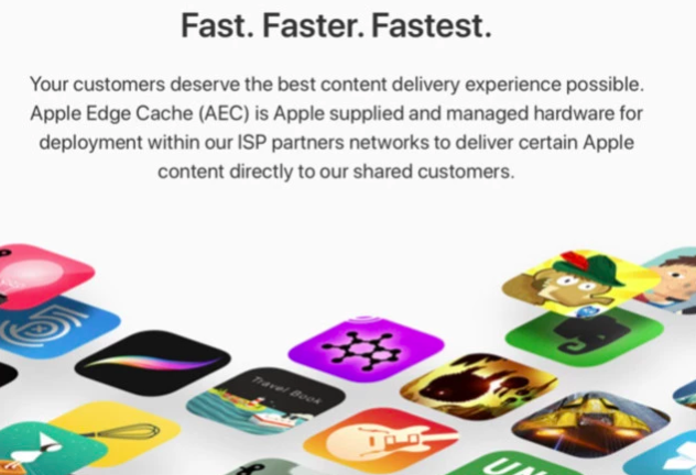 据国外媒体报道,苹果这一服务并不是针对普通消费者推出,而是帮助互联网公司等iOS应用客户,这一服务的官方名称为“苹果边缘缓存”(Apple Edge Cache),苹果官方为这一服务制定的宣传语就是“快、更快、最快”。(腾讯科技)
