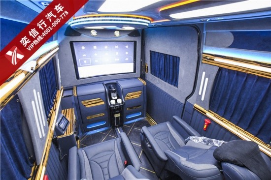 奔驰斯宾特贵宾舱内,整车采用的前后舱隔断设计,隔断处安放有一台42寸的可升降液晶电视,在配合整车 BOSE 5.1 立体环绕家庭影院组合音响,,苹果处理器,您可在如此宽广、凉爽的座舱内,享受极致的影音。