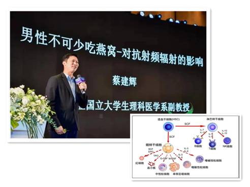 蔡教授自2003年开始研究燕窝提取物的药用性质。他講解,人體的免疫系統有白血球,白血球裡則有淋巴細胞,而淋巴細胞還可分成T4、T8等等,進而組成了一個強大的團隊;整個免疫系統其實就像國家的安全團隊,有警察、空軍、海軍、陸軍等,不同之處在於免疫系統是對抗體內的病毒。