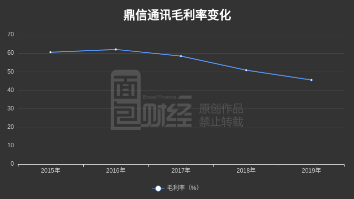 回顾公司以前业务盈利能力情况,2015年至2018年,鼎信通讯的毛利率分别为60.61%、62.09%、58.48%和50.88%。