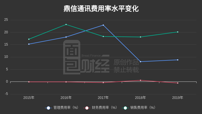 具体来看,鼎信通讯2019年销售费用为3.65亿元,同比增长15.48%,销售费用率为20.14%,较上年提升。