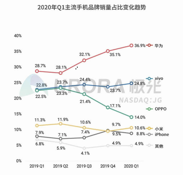 2020年第一季度因为受到疫情的影响,整个手机产业相对进入了一个比较低迷时期,极光给出的报告中称,疫情影响导致手机销售门店临时关闭,线下销售渠道受阻,供应链复工推迟,零部件和手机生产紧张,消费者居家隔离购机欲望降低或推迟购机计划,受疫情影响, Q1国内手机销售愈加艰难。