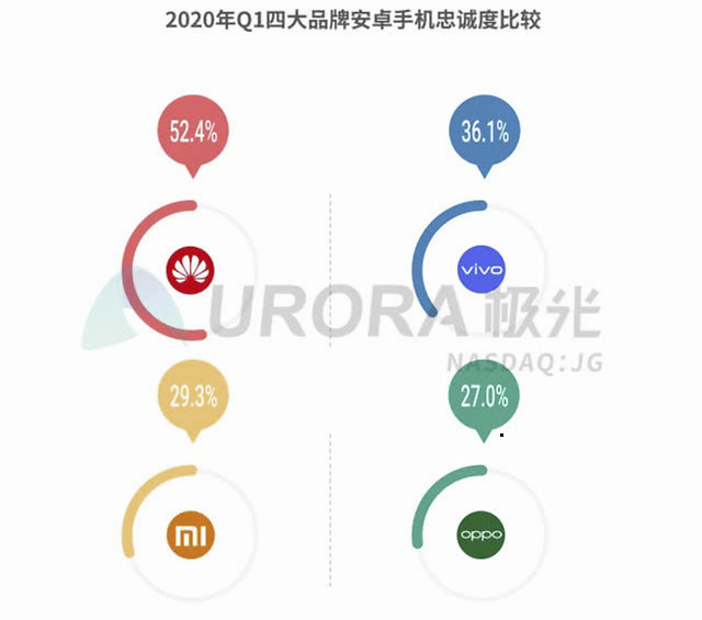 还有一个数据可以证明华为和vivo在市场和产品层面的成功。2020年Q1的品牌忠诚度方面,华为达到了52.4%,vivo也有36.1%,相对第三名都有较大幅度的领先。