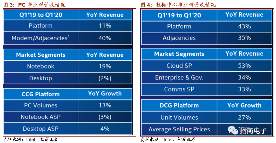 PC事业群(CCG)营收98亿美元,同比增长14%。其中数据中心事业群分部门来看,DCG部门收入70亿美元,同比+43%,其中平台营收64亿,平台销售数量和均价分别同比增长27%和13%,周边业务营收6亿;分市场来看,云计算同比+53%,企业和政府部门同比+34%,通信服务同比+33%。IOTG部门收入8.8亿美元,同比-3%,系工业和零售业的需求下降。MBLY部门收入2.5亿美元,同比+22%,主要因为虽然汽车市场下滑但MBLY部门ADAS渗透率持续提升。NSG部门收入13.4亿美元,同比+46%,系存储市场环境同比变好,NAND和Optane需求增长且ASP提升。PSG部门5.2亿美元,同比+7%,系云和企业需求增强,但嵌入式和通信部门的疲软部分抵消了PSG增长。
