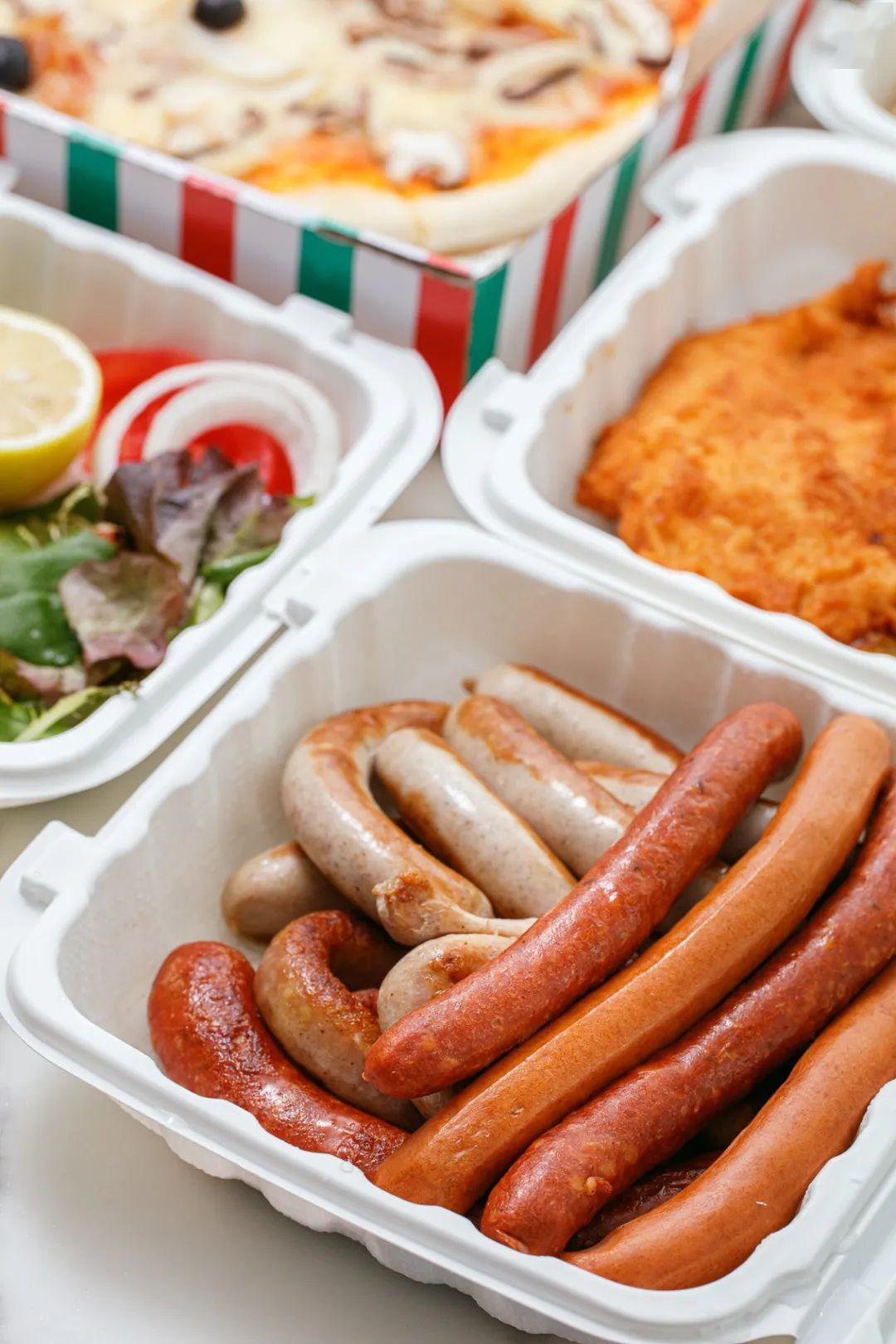 这个香肠拼盘套餐里面包括了 5 种香肠:图林根香肠、法兰克福香肠、纽伦堡香肠、红粉辣味香肠、奶酪香肠;各种各样的沙拉:土豆咸肉沙拉、黄瓜沙拉、金笋沙拉、巴伐利亚萝卜沙拉、法兰克福卷心菜沙拉、鲜番茄煮鸡蛋沙拉等;还有一块硕大的炸猪排;不仅每一个独立分开包装,而且送来时还保留着食物的温度,好评。