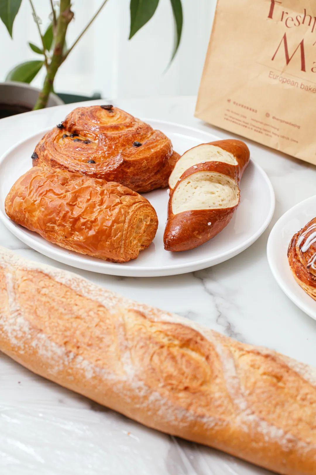 实在是太喜欢他们家的面包了,不管不顾地和小伙伴点了好多面包:巧克力牛角包、巧克力丹麦包、葡萄干丹麦包、德式咸面包、法棍。