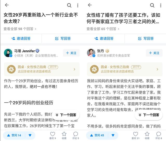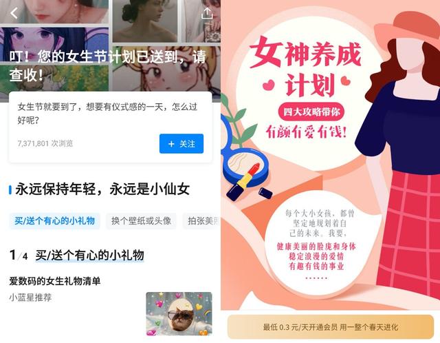 除在职场上叱咤风云,现代女性也追求生活的乐趣。妇女节前夕,知乎推出“叮!您的女生节计划已送到,请查收!”专题,从“买/送个有心的小礼物”“换个壁纸或头像”“拍张美照愉悦自己”“欢迎走进我有趣的灵魂”四个方面,唤醒女性对于美好生活的向往。同时,知乎会员推出“女神养成计划”专题,通过“颜值”、“健康”、“恋爱”、“职场”四个方面提供全面攻略,帮助女性成为更好的自己。