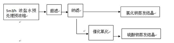 总工艺路线:预处理预浓缩+超滤纳滤分盐+催化氧化+分质结晶工艺,分别结晶出氯化钠和硫酸钠。工艺流程如下所示:
