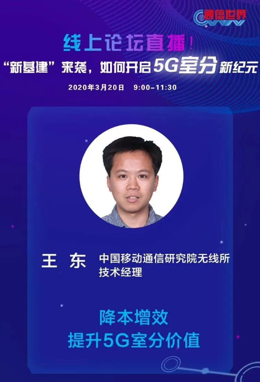 重要环节,目前5G室分技术在演进中仍有较多挑战,在三大运营商皆提出了各自的室外和室内5G方案基础上,产业链上下游如何协同发展才能提升5G室分价值,以促产业繁荣?3月20日,通信世界全媒体特策划5G室分专题线上研讨,邀请运营商、设备商、服务提供商等,从技术、网络建设等角度进行深入讨论。在会上,中国移动通信研究院无线G室分
