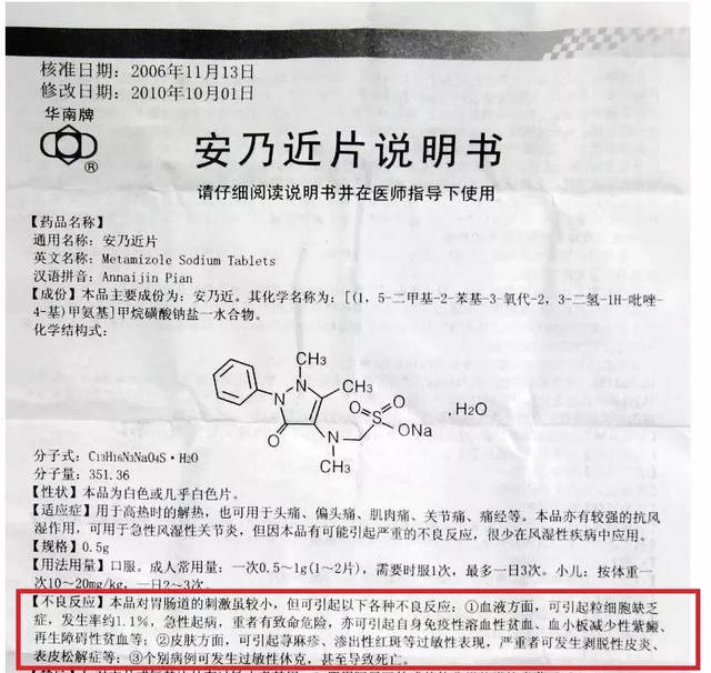 而且,安乃近的说明书中注明:引起中性粒细胞减少症的发生率高达1.1%!这意味着每100个孩子用药,就会有1个出现,这在医学统计上已经是很高的发生率了!