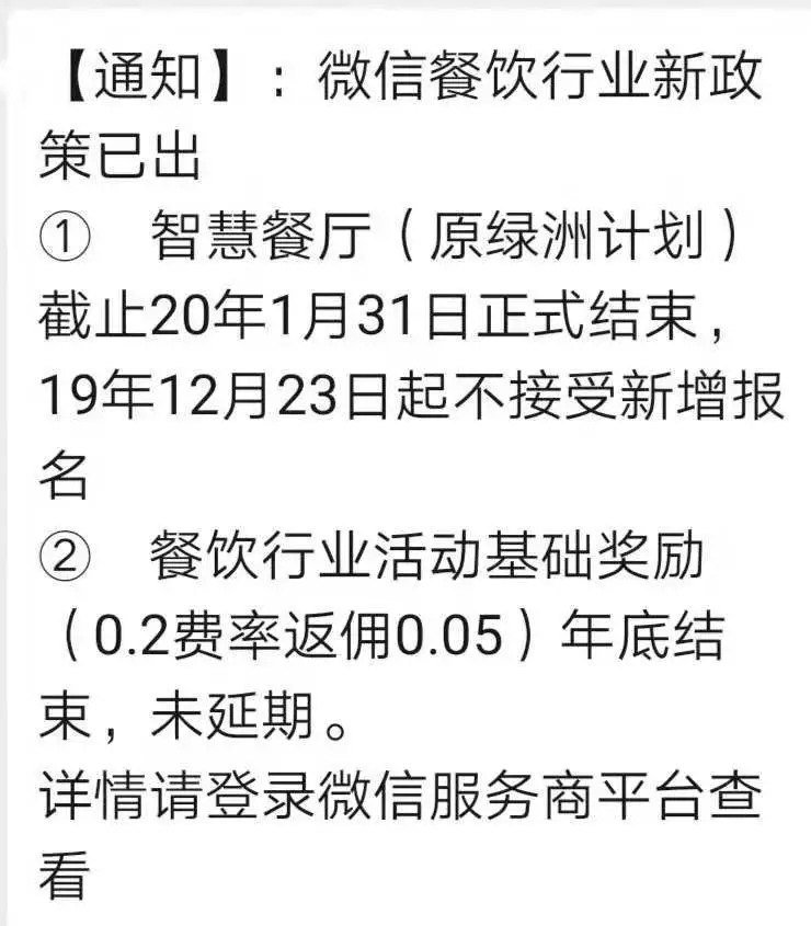 近日,微信支付疑似向服务商发布通知,“绿洲计划”在2020年1月31日正式借结束,12月23日起不再新增商户,与此同时,相关费率措施有所调整: