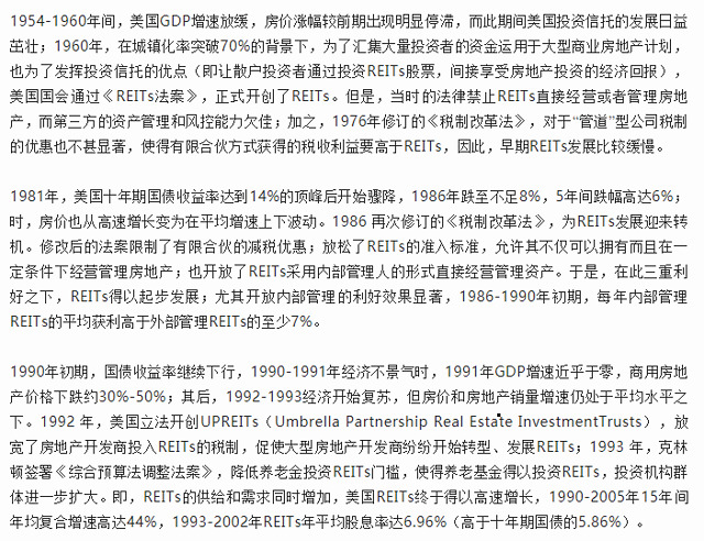 其次,REITs持有的不动产更多是经营性物业,具备创造现金流能力,有利于引导不动产投资进入价值投资的通道,对房地产行业长期稳定发展具备重要意义;