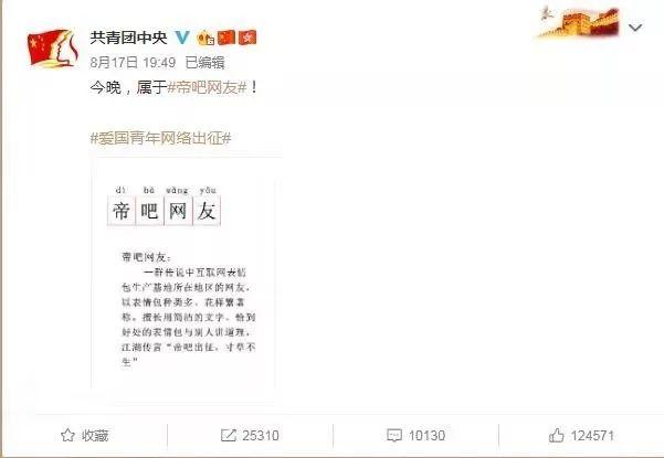 正能量满满的“出征”,也很快引来人民日报、共青团中央等新媒体平台的报道和支持,甚至《新闻联播》节目也为“帝吧”的行为点赞。