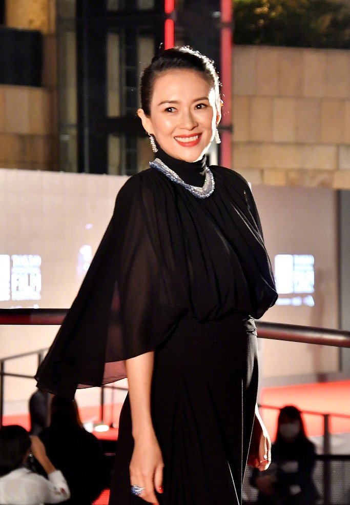 章子怡是首个获邀并在戛纳开大师班的亚洲电影人,还是第32届东京国际电影节主竞赛单元评审团主席,二胎孕期挺着孕肚走上红毯,已经四十岁的章子怡,身穿一袭黑色雪纺纱裙,浑身散发着母性光辉。高领黑裙脖颈外搭配华丽的钻石项链,雍容华贵浑身散发着迷人的魅力。红唇淡妆出镜,脸上笑容也多了几分温柔,自信极了。