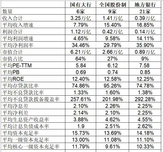 下面,我们把36家上市银行分成三个梯队进行分析,分别是:国有大行(工农、中、建、交、邮储等6家)、全国股份制银行(招商、兴业、民生、平安、华夏、光大、浦发、中信、浙商等9家)和地方性银行(21家)。