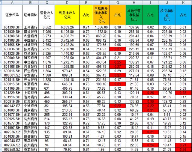 36家上市银行中,利息净收入在总收入的占比平均为73%;手续费及佣金净收入平均占比为13%;其他经营净收益平均占比13%;投资收益平均占比为11%。