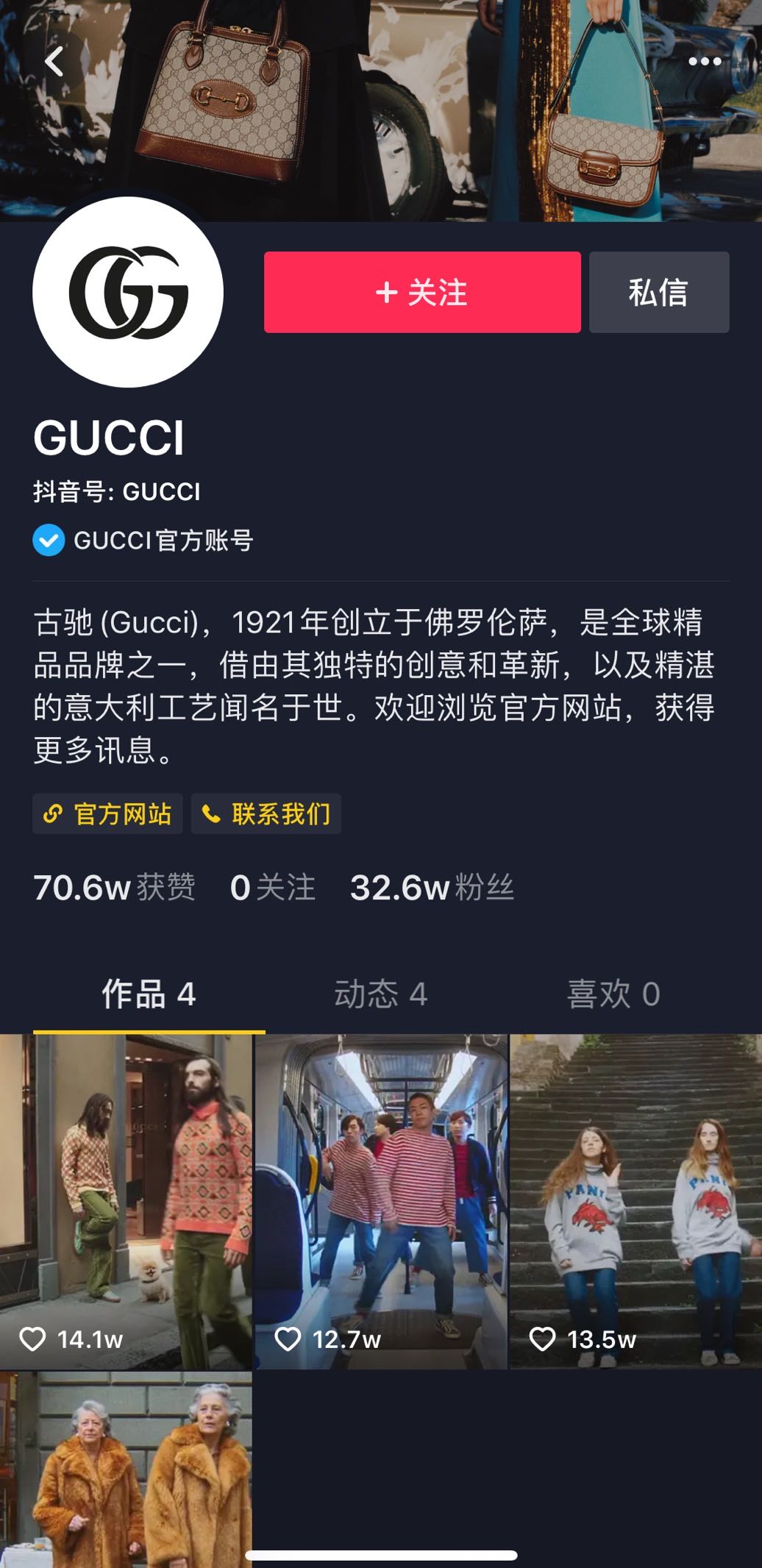 周三,意大利奢侈品牌Gucci周三正式开通抖音账号,目前已发布4个视频,获得70.6万赞,收获32.6万粉丝。